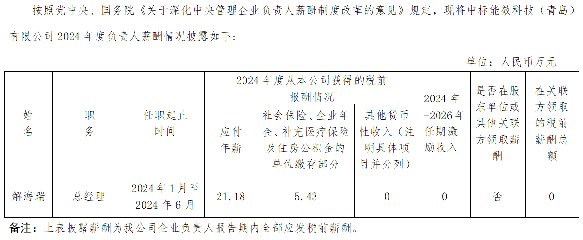 中標能效科技(青島)有限公司企業負責人2024年度薪酬情況