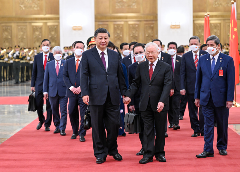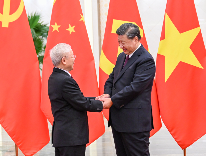 習近平熱烈歡迎阮富仲在中共二十大召開后即對中國進行正式訪問。習近平表示,近年來,我同阮富仲總書記同志通過多種方式保持密切溝通,就引領中越關系發展達成許多重要共識,這些共識得到全面落實,取得顯著成效。