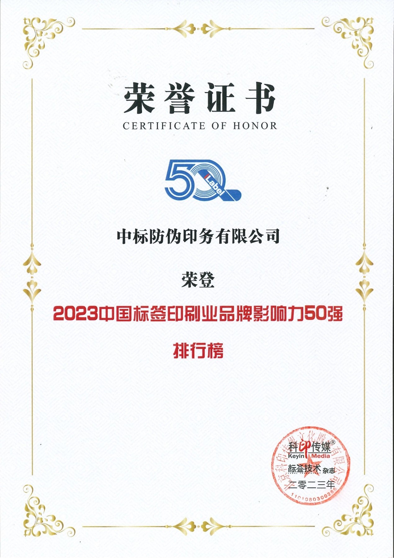 11月1日, “2023標簽印刷業(yè)品牌影響力50強”頒獎典禮在上海舉辦,大會同期發(fā)布了“2023標簽印刷業(yè)品牌影響力50強”企業(yè)榮譽榜單。中標防偽的企業(yè)資質、獲獎情況和行業(yè)影響等綜合能力得到評委會專家的一致認可,連續(xù)兩年獲評“中國標簽印刷業(yè)品牌影響力50強”。通過參評,中標防偽提升了品牌影響力,增強了產品競爭力,促進公司轉型高質量發(fā)展。