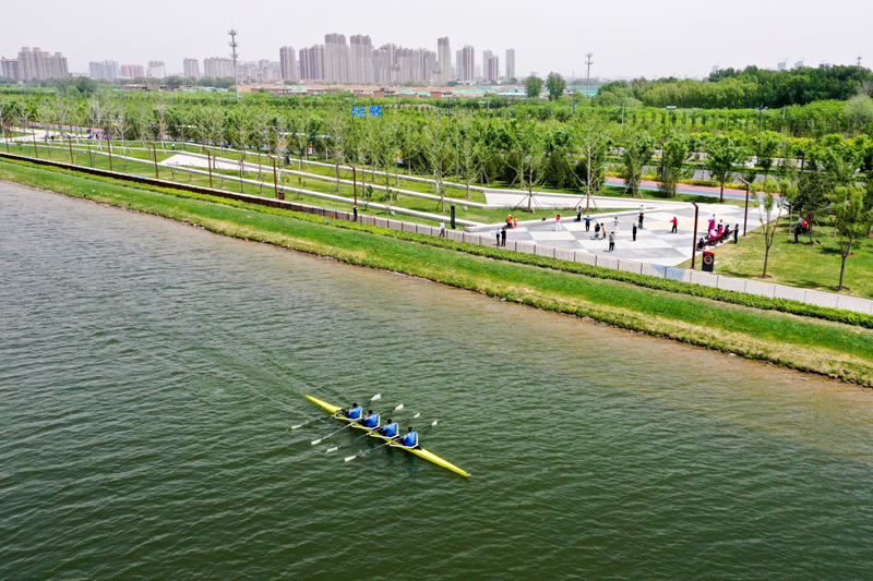 山西皮劃艇隊隊員在汾河太原城區晉陽橋段水面上訓練(2020年5月12日攝,無人機照片)。新華社記者 曹陽 攝
